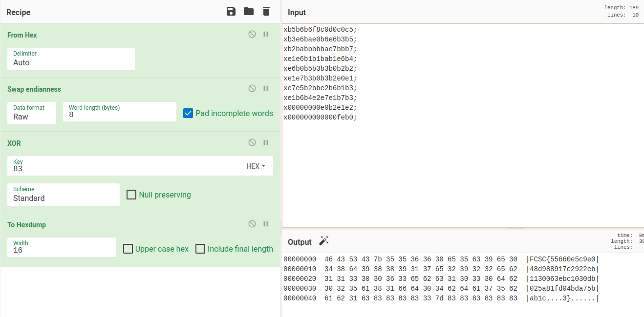 mem = lambda addr, sz: b''.join(cast(addr+i, POINTER(c_char)).contents for i in range(sz))Je passe les détails du dump des pages associées à lib_flag.so, toutes les adresses sont données, j'encode en hexa le total et je rapatrie sur ma machine.